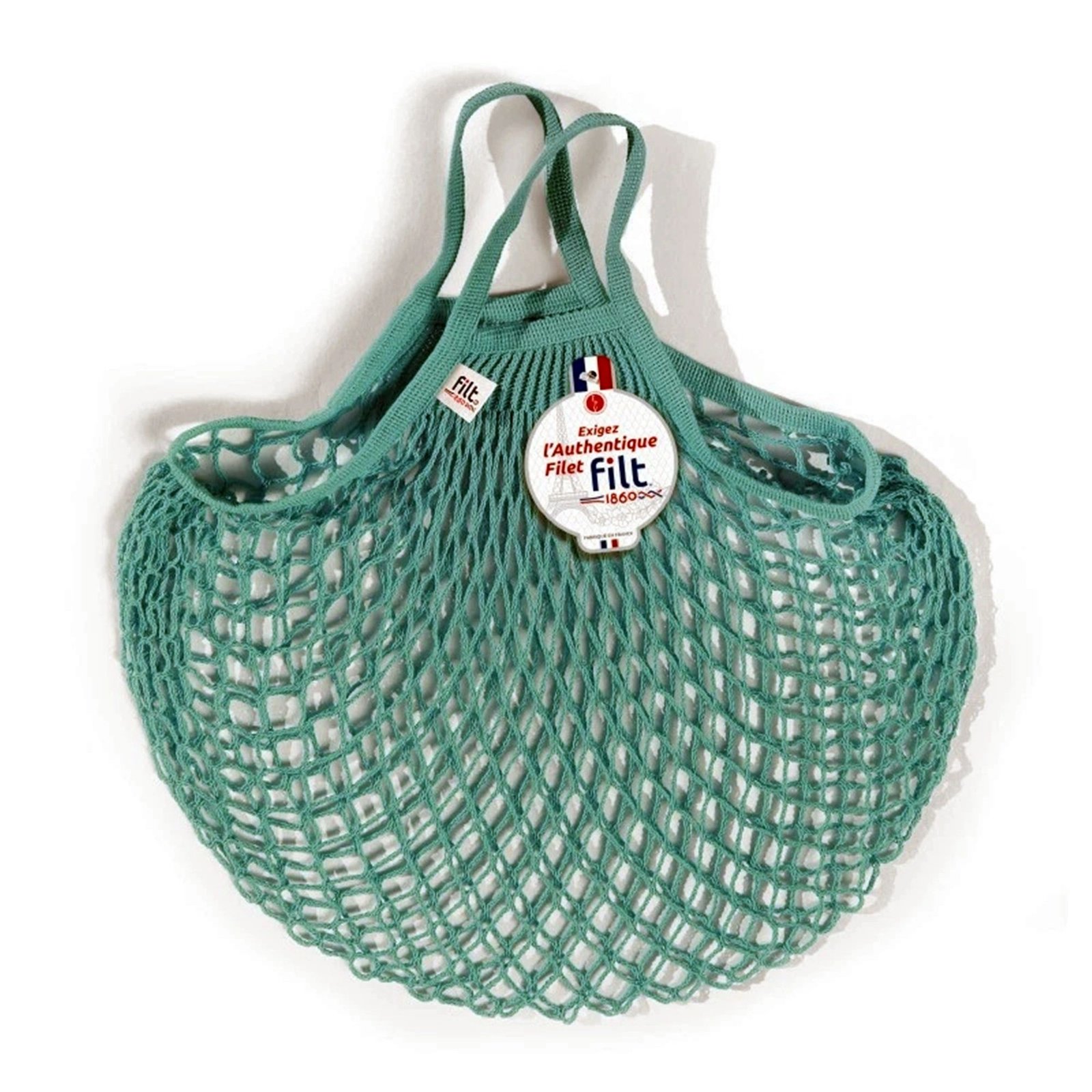 French Market Net Bag – AquaBlue Color- Medium w/Short Handles Filt, based in Normandy, France has been making woven cotton bags, fishing nets, ropes, candle wicks and other woven cotton goods since 1860. Their bags, also called filets, are lightweight, durable, expandable and stylish. Often imitated but never duplicated, Filt bags are perfect for everyday errands and adventures alike. This Medium cotton net shopper measures 15.74″ x 15.74″ and the handles are 9″. Easily fits a bottle of wine, a baguette and a few items of fresh produce. Keep one (or a few) in your car, closet or bag! Made in France