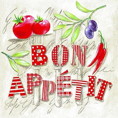 This charming luncheon size paper napkin features “Bon Appetit” in cute red lettering. There are 20, 3-ply paper, disposable napkins in each package. The luncheon size is 6 1/2″ square as folded and the design is on all panels. Made in The Netherlands, these napkins are 100% chlorine free, biodegradable and are made with water based ink.