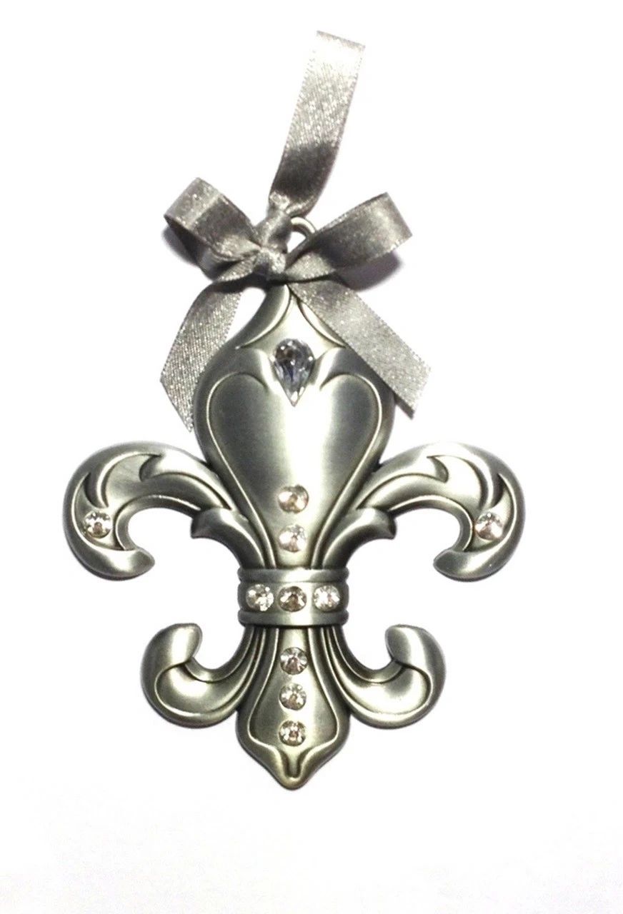 Ornament – “Fleur de Lis” – Pewter w/Crystals – Beautiful Detail & Design – Boxed This beautiful, ornately detailed, pewter fleur de lis ornament is embellished with crystals and a bow at the top. It measures 4 1/4″ high x 3 1/2″ wide and the back side is plain. Sure to add style and sparkle to your Christmas tree – or will be a beautiful piece of art just hanging on a wall. Boxed