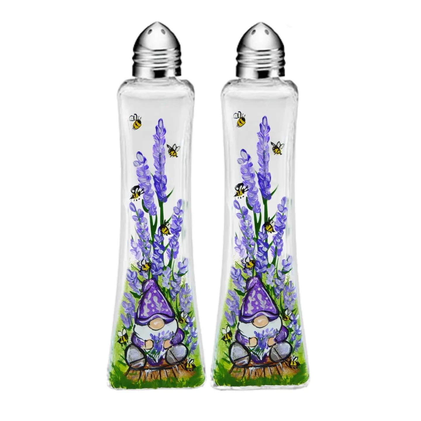 A Lavender Gnome Garden Bee Hand-Painted Salt & Pepper Set is a charming addition to any kitchen or dining table. Made in the USA by Classy Art Designs, this novelty set features a clear glass base with a gnome and a whimsical lavender bee pattern. Each shaker is 5.5″ tall x 1.5″ wide x 1.5″ deep and a silver metal top with holes. Design is on the front of shaker only. HAND WASH ONLY. DO NOT PUT IN DISHWASHER.